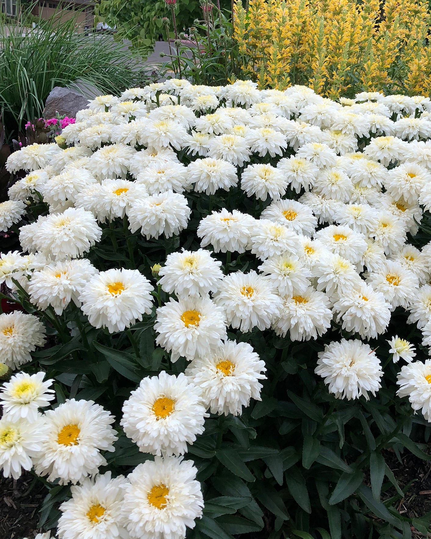 The perfect little “cookie”, Leucanthemum 'Macaroon' forms a shorter mound approximately 20″ tall and is well-branched with many stems. The double flowers start out yellow and open to bi-color white with yellow centers, then, when fully mature are white with gold centers. Charming and useful in containers, edges and in mass.