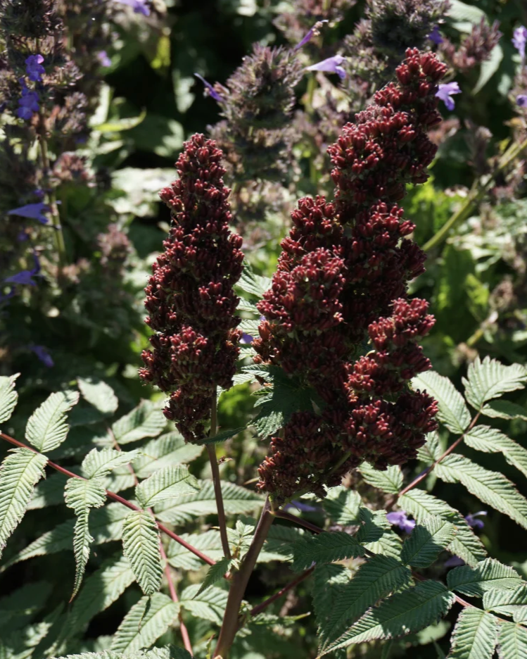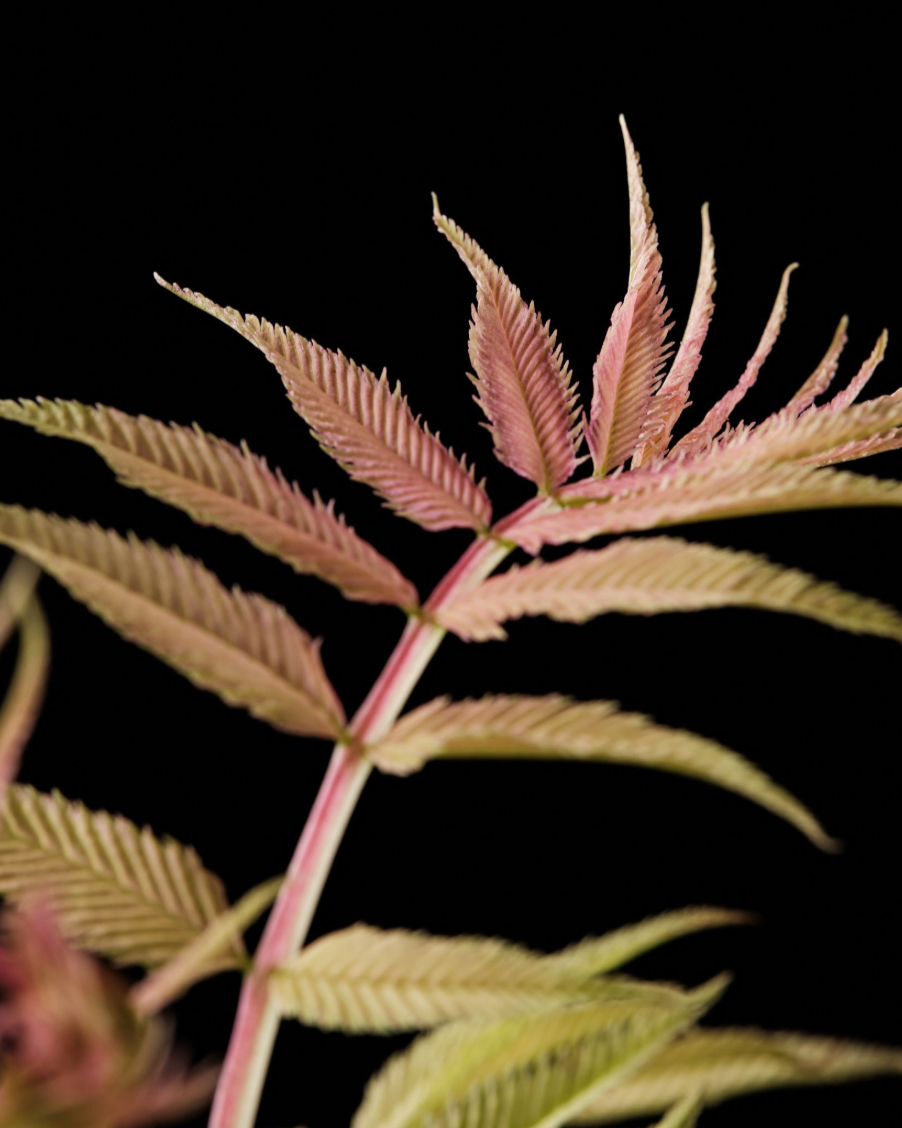 Sorbaria has traditionally been considered a landscape plant and is relatively new to the cut flower scene. ‘Cherry on Top’ is an ever-changing plant that is as much of a treat in the flower field or garden as it is in the vase. Foliage emerges pink and bronze and matures into a beautiful deep green with age – the flower stalks emerge as white plumes that transform into beautiful red seed pods which can be used in fall arrangements. You can cut these branches at different times in the season depending on your needs. The shrub will max out at about 5 feet in height and width and is very cold hardy and tolerant of most conditions. This is a false spiraea that really has it all!